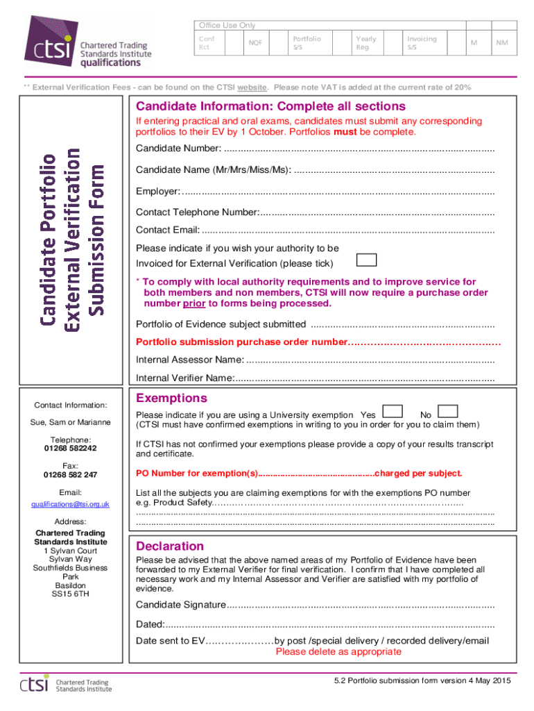 Office Use Only Conf RctNQFPortfolio S/SYearly RegInvoicing S/SMNM** External Verification Fees can be found on the CTSI website. Please note VAT is added at the current rate of 20%Candidate Information:
