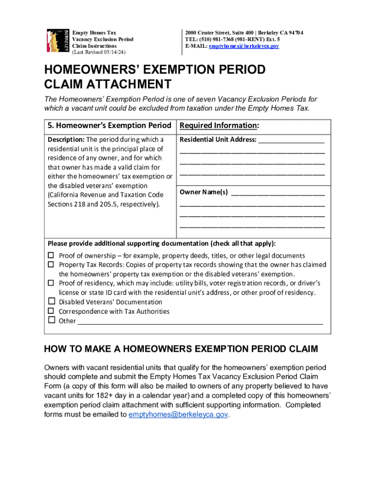 Empty Homes Tax Vacancy Exclusion Period Claim Instructions (Last Revised 05/14/24)2000 Center Street, Suite 400 | Berkeley CA 94704 TEL: (510) 9817368 (981RENT) Ext. 5 EMAIL: emptyhomes@berkeleyca.govHOMEOWNERS
