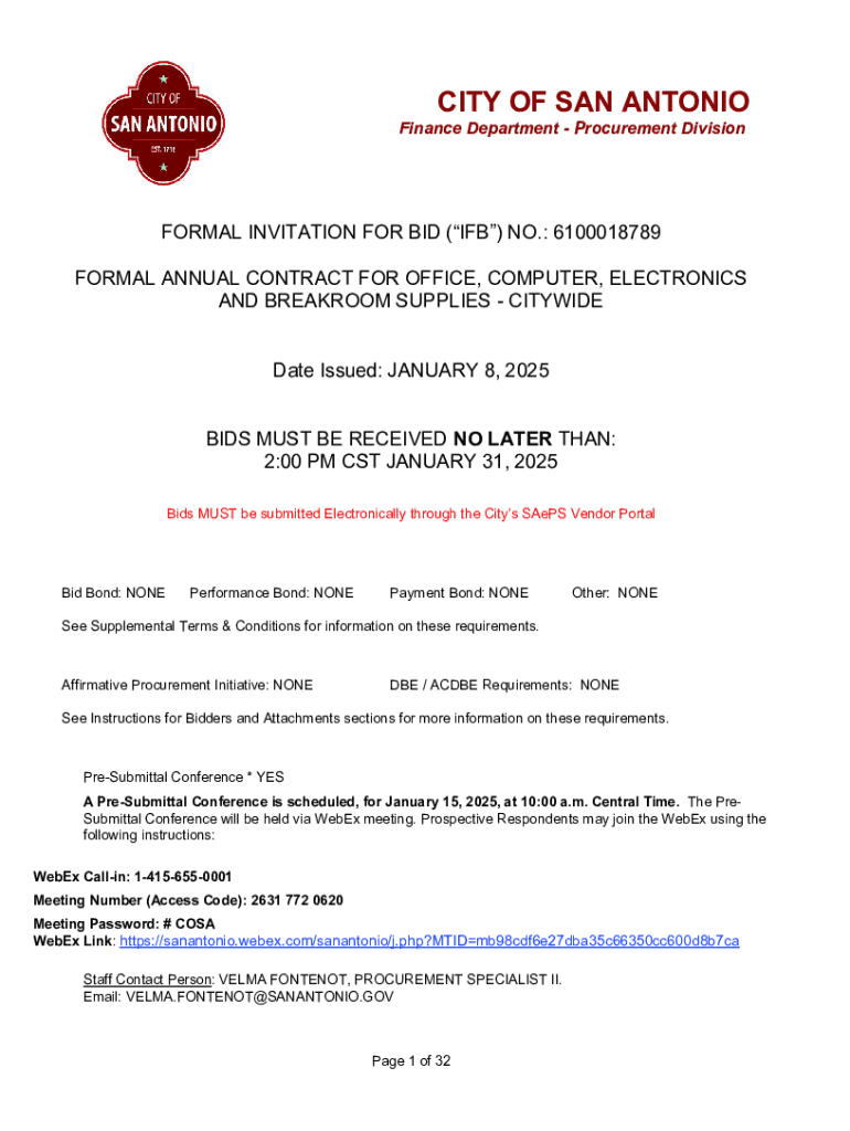 CITY OF SAN ANTONIO Finance Department Procurement DivisionFORMAL INVITATION FOR BID (IFB) NO.: 6100018789 FORMAL ANNUAL CONTRACT FOR OFFICE, COMPUTER, ELECTRONICS AND BREAKROOM SUPPLIES CITYWIDE