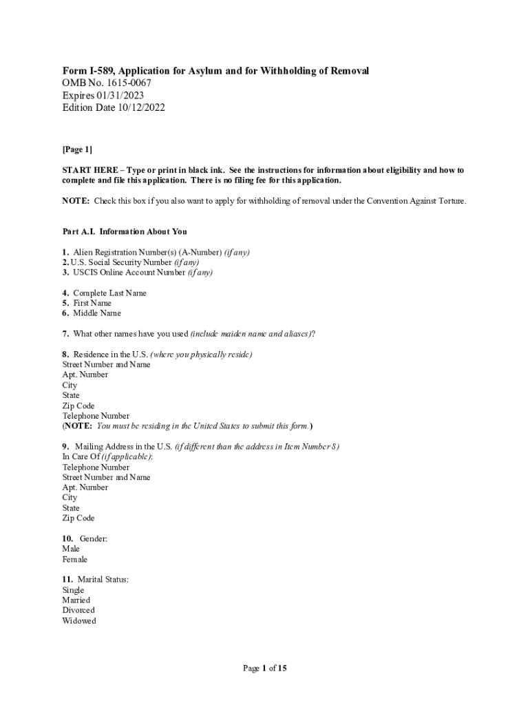 Form I589, Application for Asylum and for Withholding of Removal OMB No. 16150067 Expires 01/31/2023 Edition Date 10/12/2022[Page 1] START HERE Type or print in black ink. See the instructions for