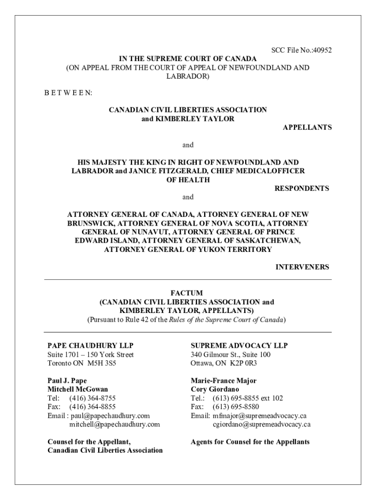 SCC File No.:40952IN THE SUPREME COURT OF CANADA (ON APPEAL FROM THE COURT OF APPEAL OF NEWFOUNDLAND AND LABRADOR) B E T W E E N: CANADIAN CIVIL LIBERTIES ASSOCIATION and KIMBERLEY TAYLORAPPELLANTSand