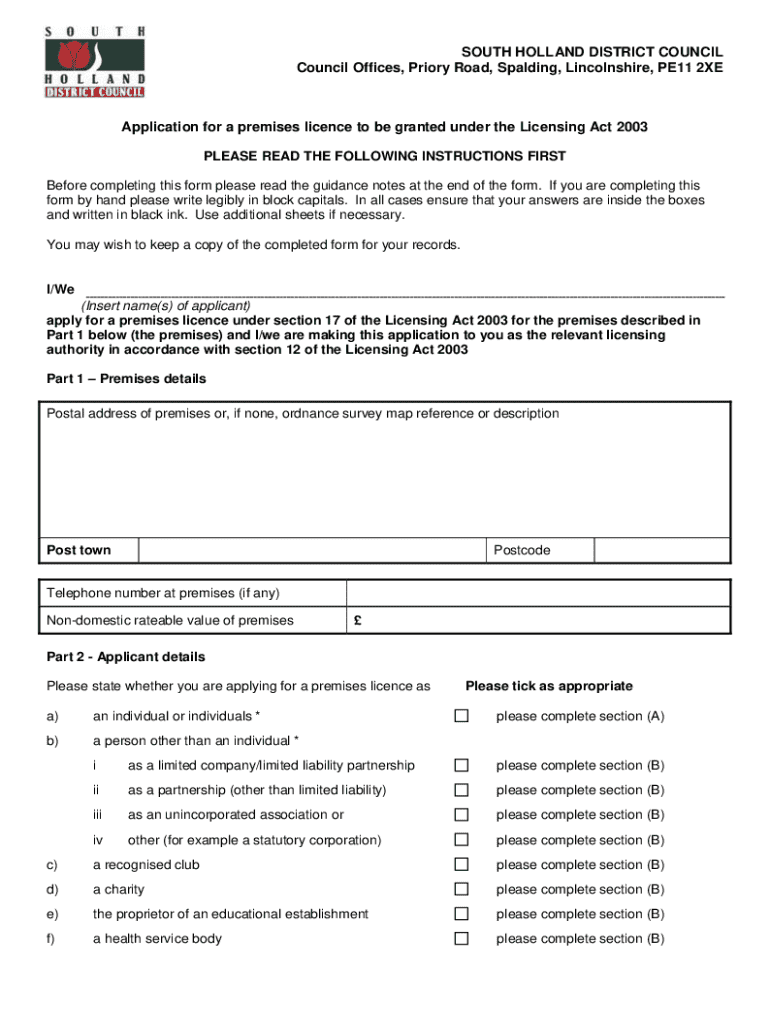 SOUTH HOLLAND DISTRICT COUNCIL Council Offices, Priory Road, Spalding, Lincolnshire, PE11 2XEApplication for a premises licence to be granted under the Licensing Act 2003 PLEASE READ THE FOLLOWING