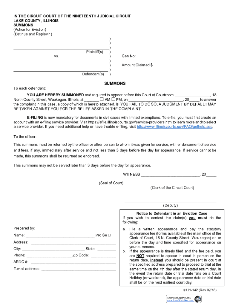 IN THE CIRCUIT COURT OF THE NINETEENTH JUDICIAL CIRCUIT LAKE COUNTY, ILLINOIS SUMMONS (Action for Eviction) (Detinue and Replevin) ) ) ) Plaintiff(s) ) vs. ) Gen No: ) ) Amount Claimed $___ ) Defendant(s)