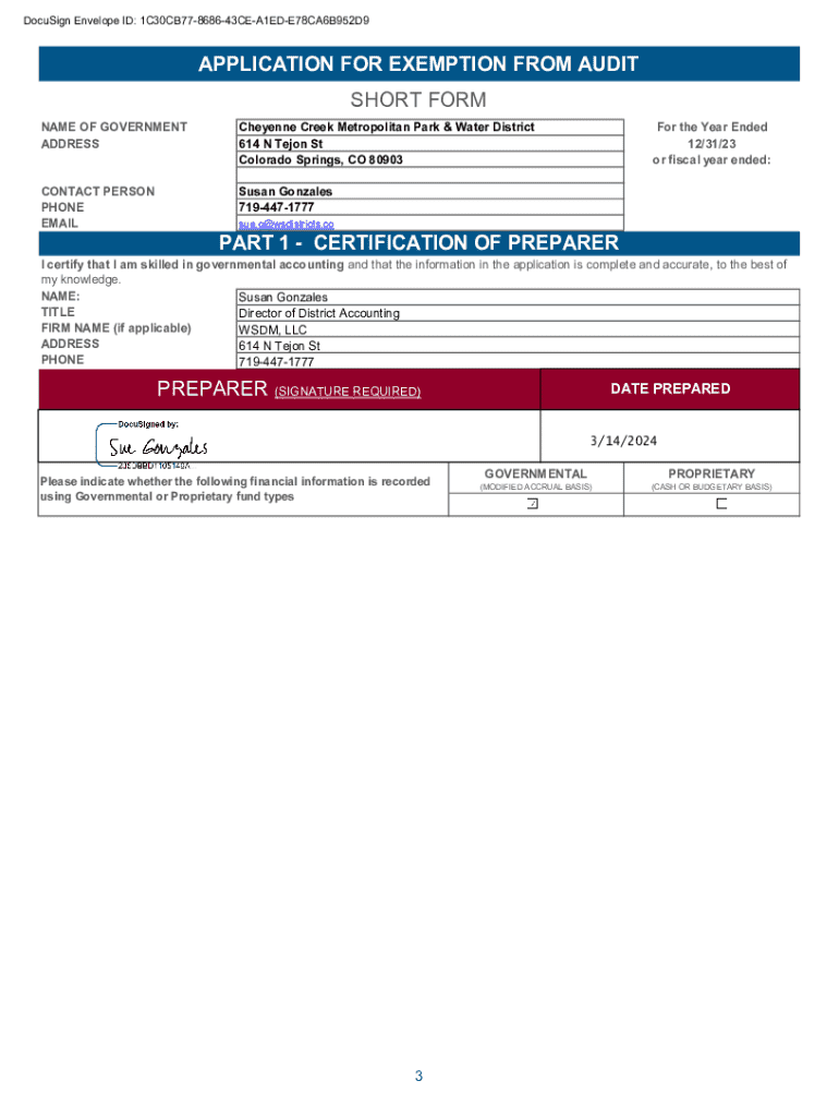 DocuSign Envelope ID: 1C30CB77868643CEA1EDE78CA6B952D9APPLICATION FOR EXEMPTION FROM AUDIT SHORT FORM NAME OF GOVERNMENT ADDRESSCheyenne Creek Metropolitan Park & Water District 614 N Tejon St Colorado