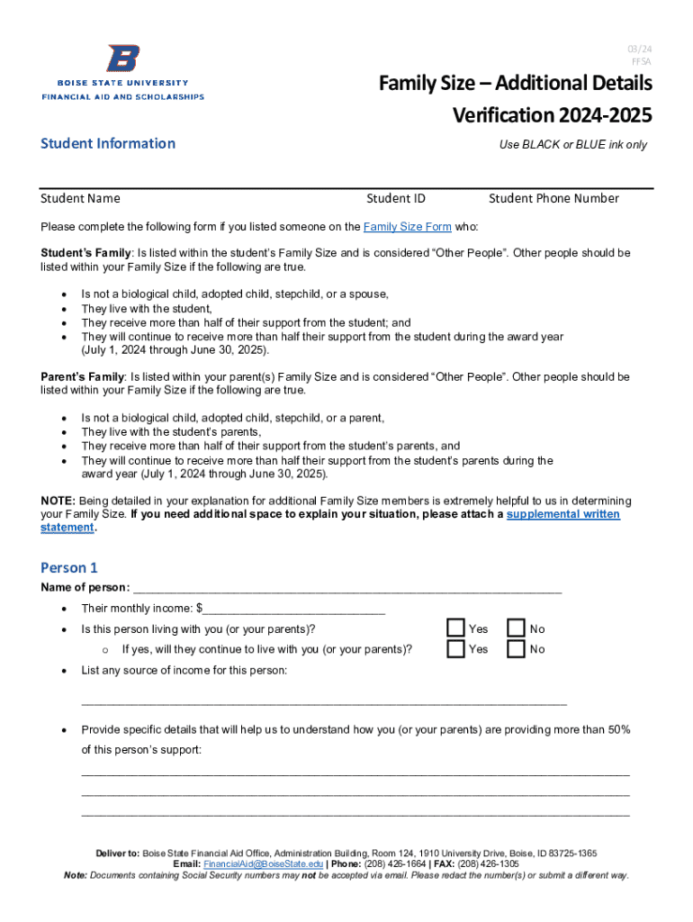 This form is to provide additional details regarding your family size for the verification process related to financial aid for the academic year 2024-2025. It helps in understanding who is included in your family size and how support is provided.