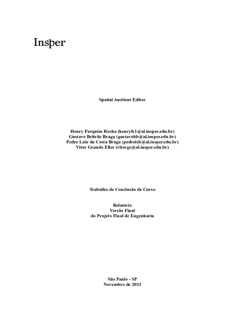 Spatial Ambient EditorHenry Furquim Rocha (henryfr1@al.insper.edu.br) Gustavo Beltro Braga (gustavobb@al.insper.edu.br) Pedro Luiz da Costa Braga (pedrolcb@al.insper.edu.br) Vitor Grando Eller (vitorge@al.insper.edu.br)Trabalho
