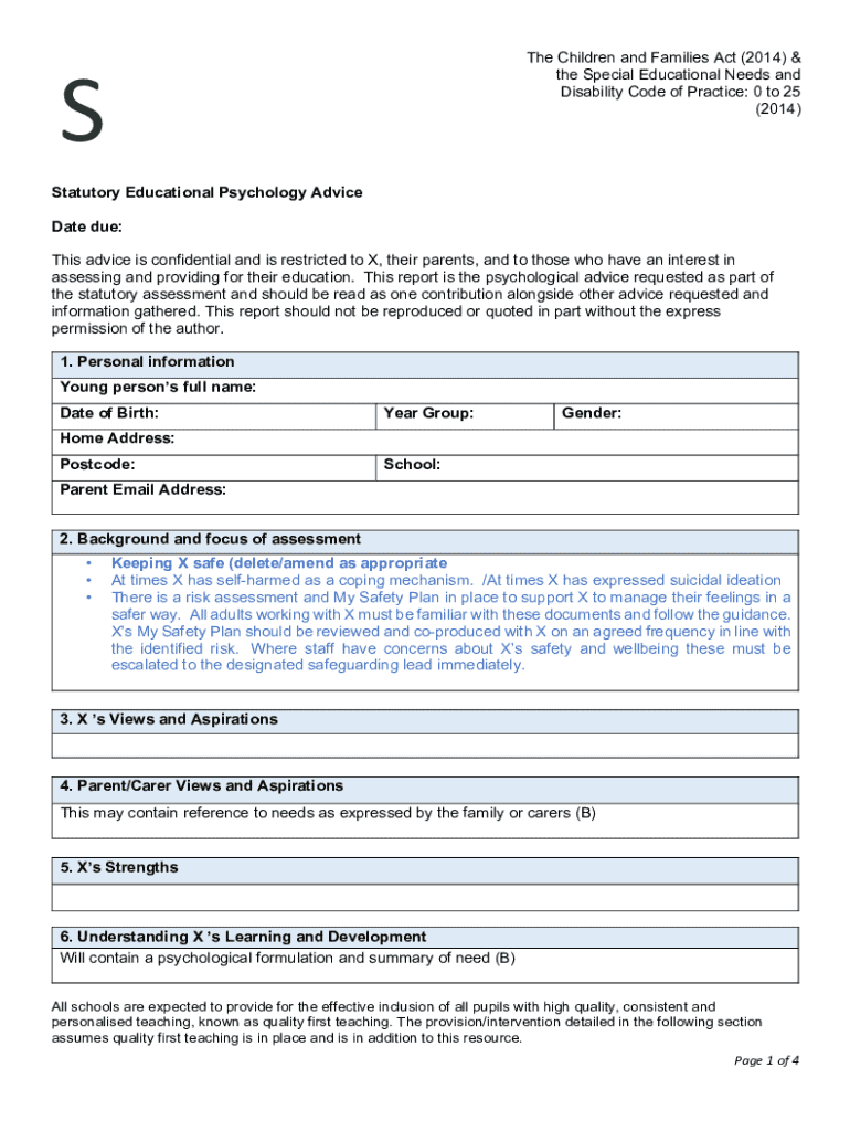 SThe Children and Families Act (2014) & the Special Educational Needs and Disability Code of Practice: 0 to 25 (2014)Statutory Educational Psychology Advice Date due: This advice is confidential and
