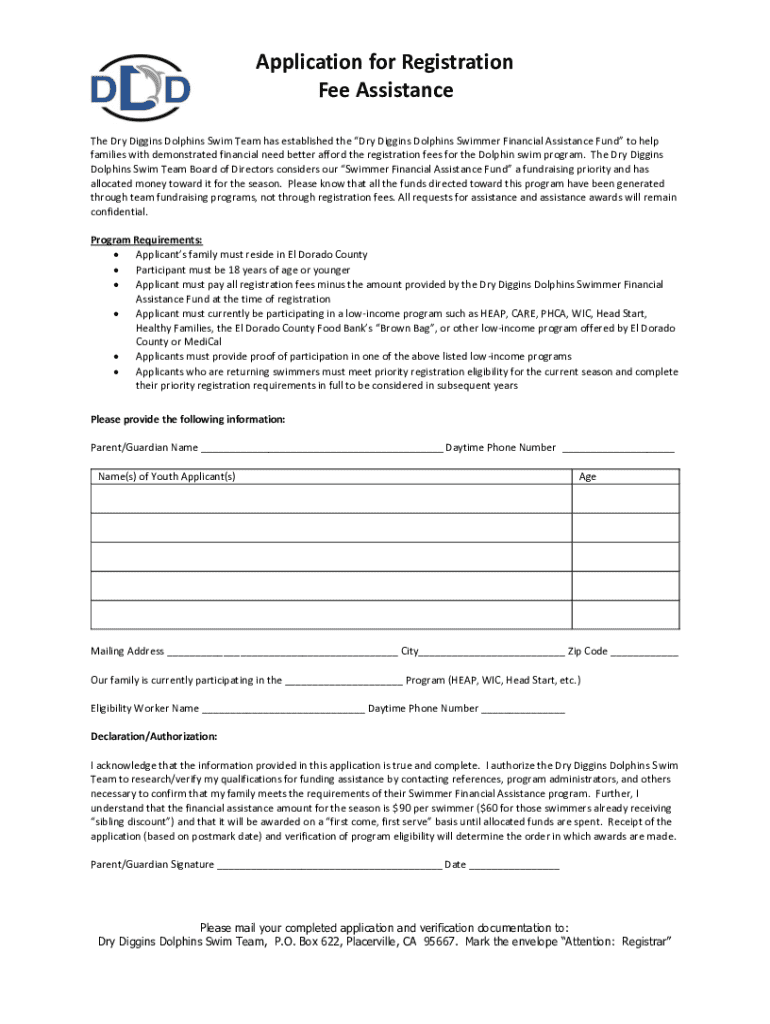 This application is for families seeking financial assistance to help cover registration fees for the Dry Diggins Dolphins Swim Team. The assistance is available for eligible applicants residing in El Dorado County and currently participating in designated low-income programs.