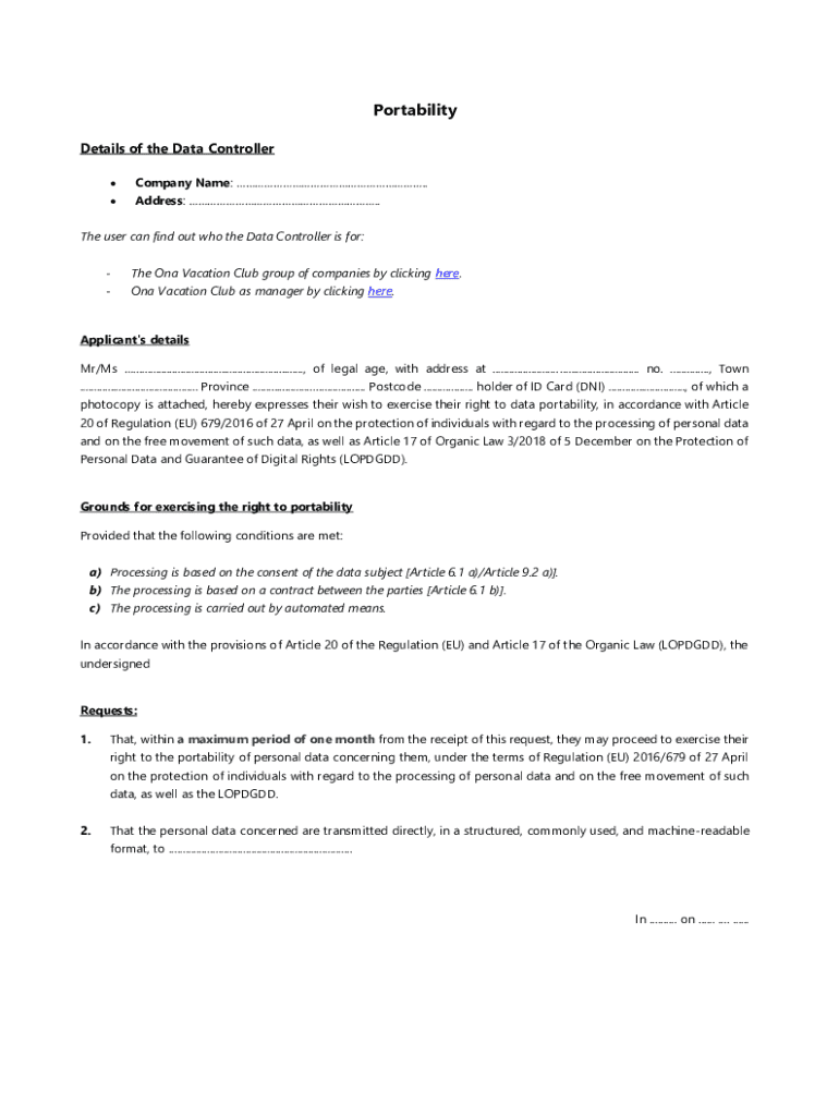 Portability Details of the Data Controller Company Name: ..Address: ..The user can find out who the Data Controller is for: The Ona Vacation Club group of companies by clicking here.Ona Vacation Club