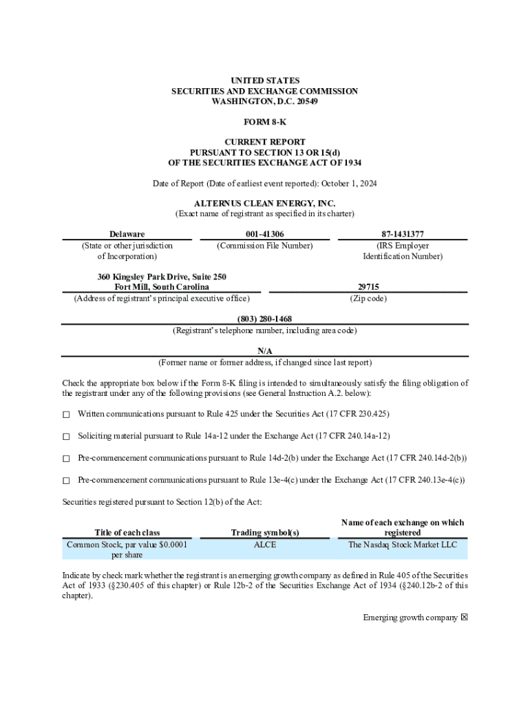 This report discusses the entry of Alternus Clean Energy, Inc. into a Securities Purchase Agreement. The agreement involves the issuance of senior convertible notes and warrants to an institutional investor, along with details about the convertible notes\' terms, use of proceeds, maturity date, conversion options, and covenants.