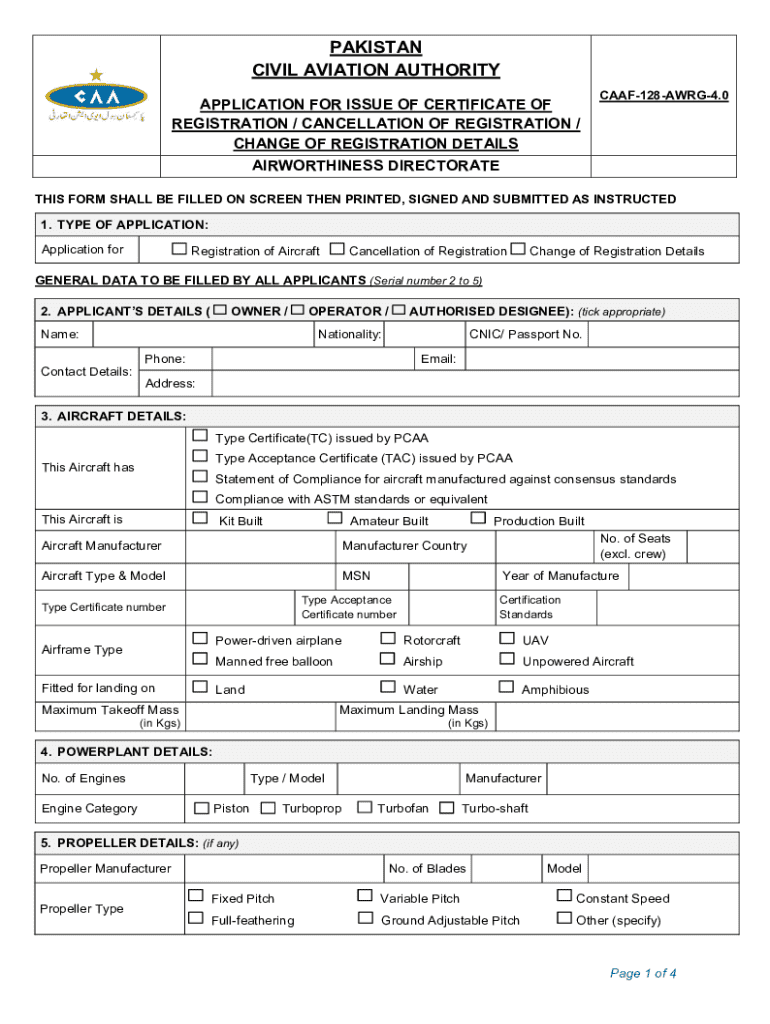 This application form is utilized for the registration, cancellation, or modification of registration details for aircraft under the jurisdiction of the Pakistan Civil Aviation Authority.