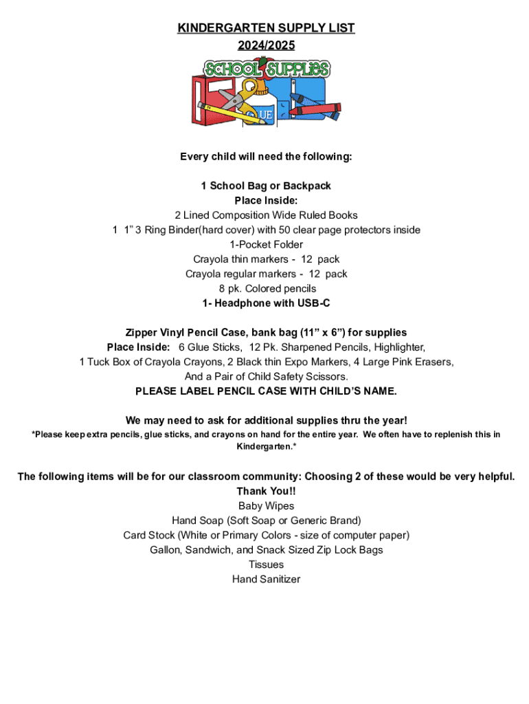 Get the free Kindergarten and Grades 1-5 Supply List