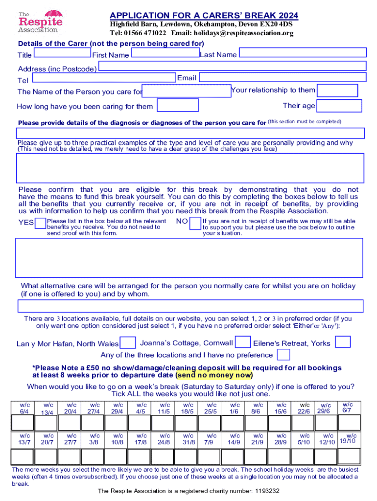 Get the free Application for a Carers’ Break 2024