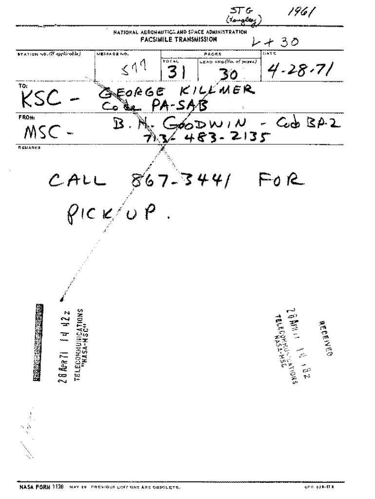 NATIONAL AERONAUTIC::..AND SCE ADMINISTRATIONFACSIMILE TRAHSMISSIOH STATIONNO.(If !pplicabk)MESSAGE NO,.TO,PAGES1 TOTAL3L.EAOA.No(No of pages)J /\"YODATEJ.8,7/KSCFROM:MSCREMARKS,/.. J\'if\'N\' _.