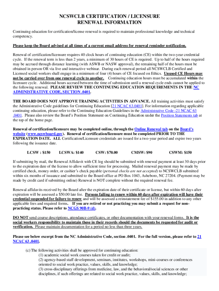 This document provides the requirements and guidelines for renewing certification or licensure for social workers in North Carolina, detailing the necessary continuing education hours, fees, and submission