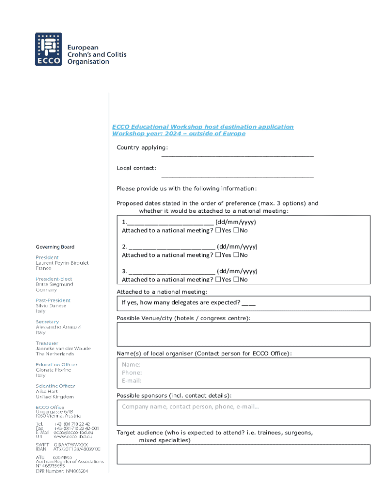 This document serves as an application form for hosting the ECCO Educational Workshop outside of Europe in 2024, including details for proposed dates, local contacts, expected delegates, venue information, sponsors, and target audience.