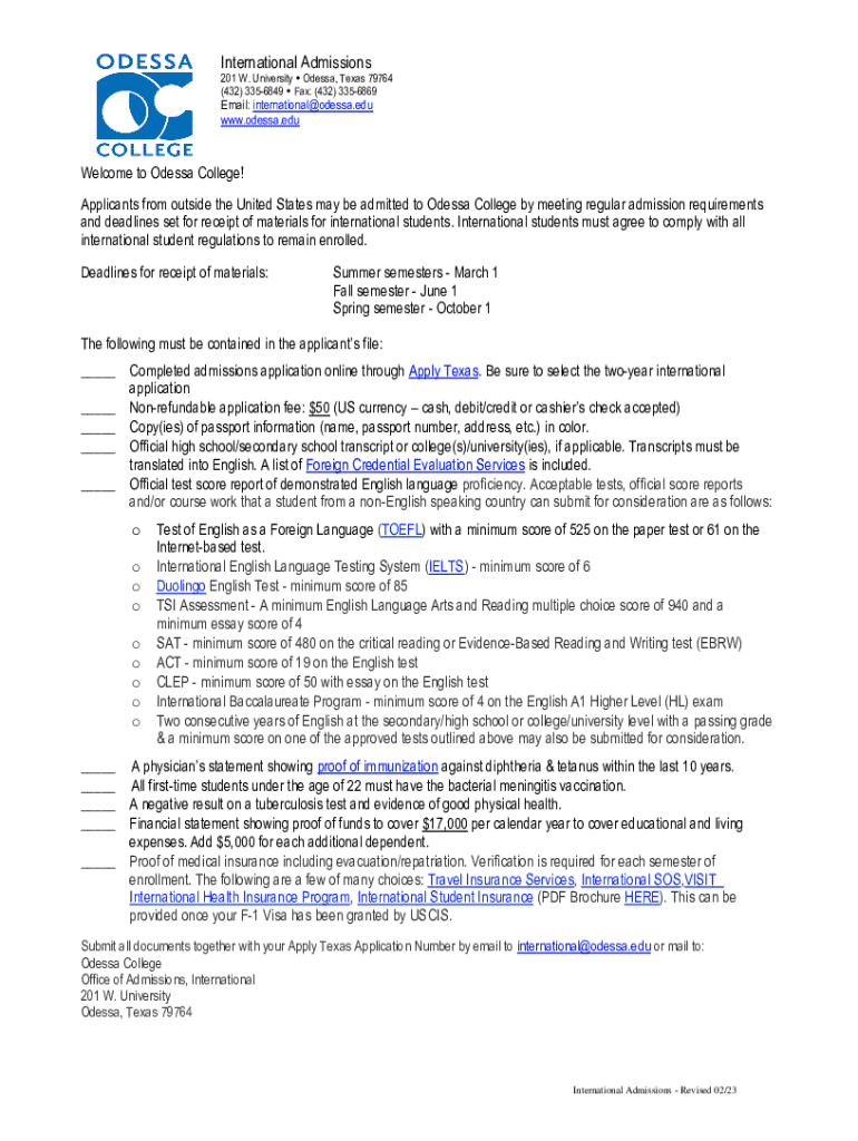 International Admissions201 W. University Odessa, Texas 79764 (432) 3356849 Fax: (432) 3356869Email: international@odessa.edu www.odessa.eduWelcome to Odessa College! Applicants from outside the United