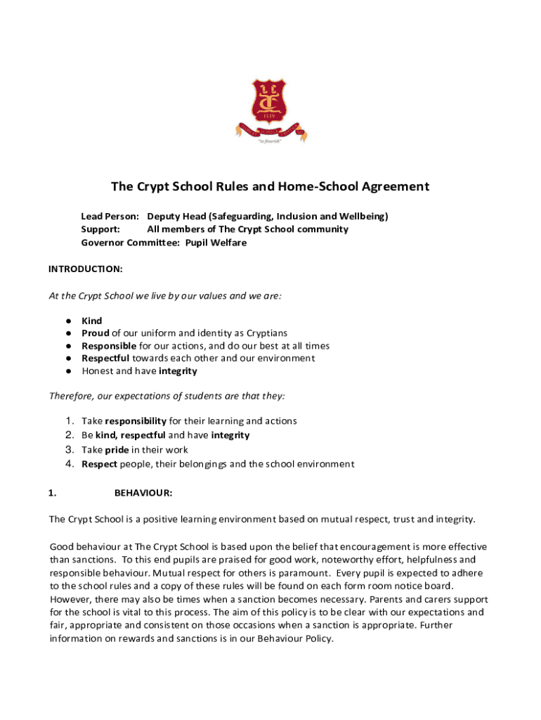 The Crypt School Rules and HomeSchool Agreement Lead Person: Deputy Head (Safeguarding, Inclusion and Wellbeing) Support: All members of The Crypt School community Governor Committee: Pupil Welfare