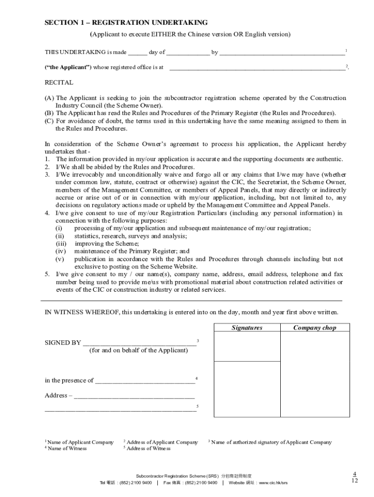 SECTION 1 REGISTRATION UNDERTAKING (Applicant to execute EITHER the Chinese version OR English version) THIS UNDERTAKING is made ___ day of ___ by ___1 (the Applicant) whose registered office is at