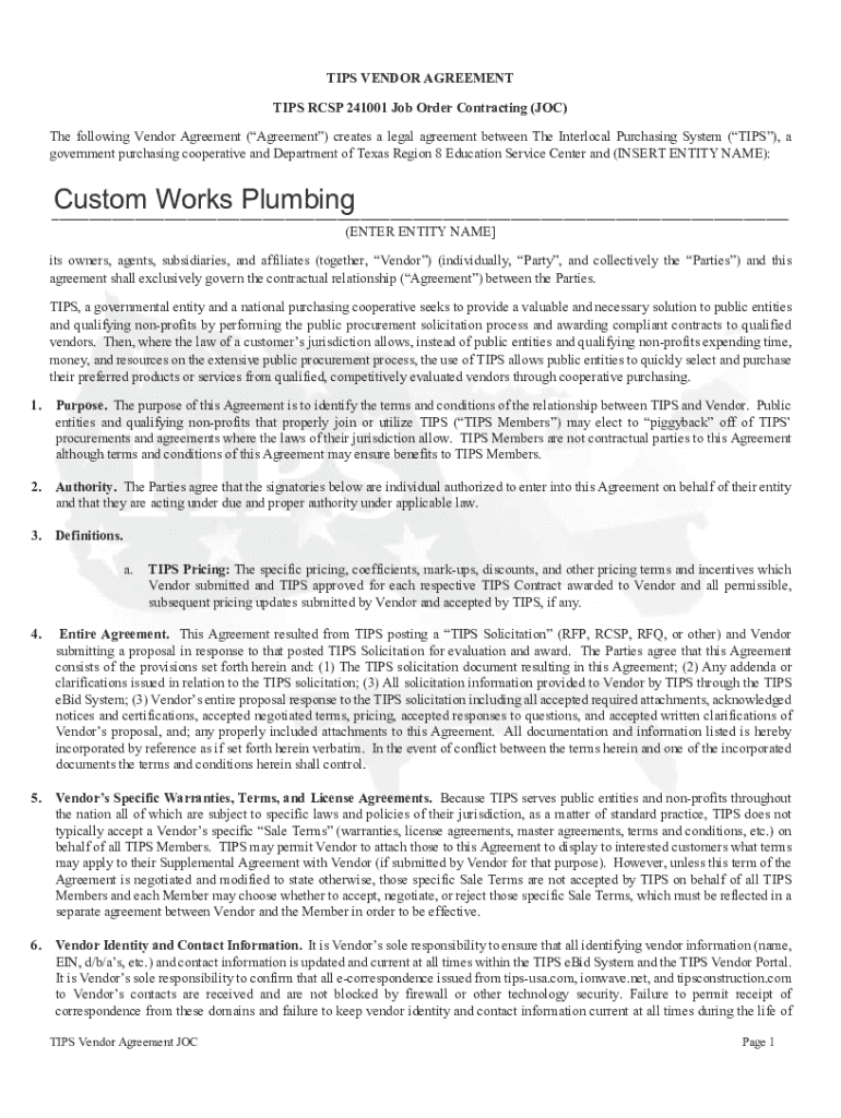 TIPS VENDOR AGREEMENT TIPS RCSP 241001 Job Order Contracting (JOC) The following Vendor Agreement (Agreement) creates a legal agreement between The Interlocal Purchasing System (TIPS), a government