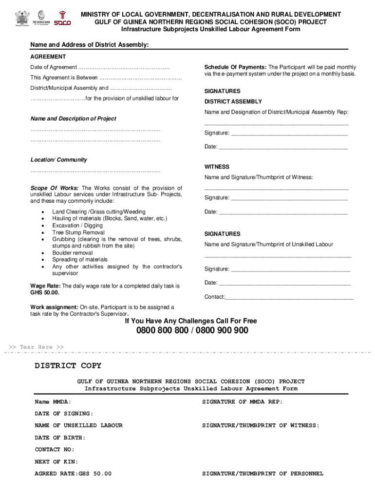 This document is an agreement between the District/Municipal Assembly and individuals providing unskilled labour under the Gulf of Guinea Northern Regions Social Cohesion (SOCO) Project. It outlines the scope of work, payment schedule, wage rate, and includes signature and witness sections.