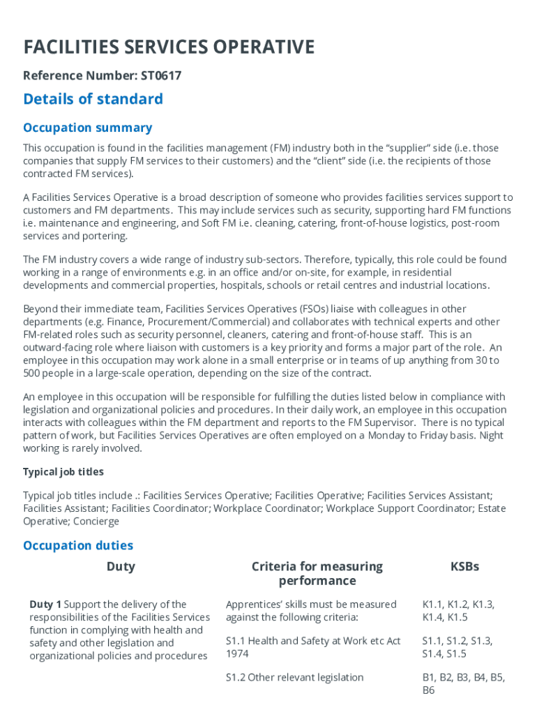 This document provides an overview of the Facilities Services Operative occupation, outlining responsibilities, skills, knowledge, and expected behaviors within the facilities management industry. It details typical duties, performance criteria, and qualifications required for apprentices in this role.