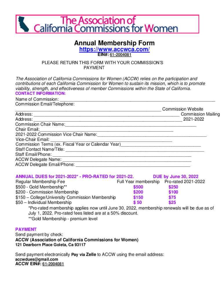 Formulario de membresía anual para Comisiones de Mujeres en California que detalla la información de contacto, cuotas anuales y opciones de pago.