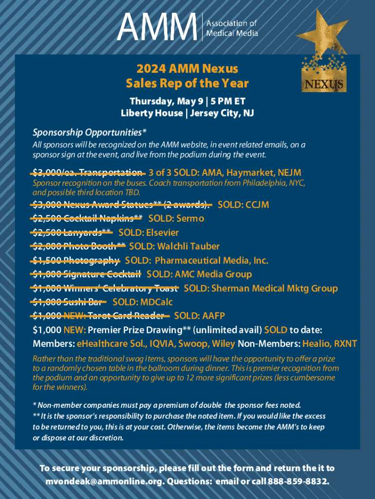Sponsorship opportunities for the 2024 AMM Nexus Sales Rep of the Year event, including various sponsorship items and acknowledgement details.