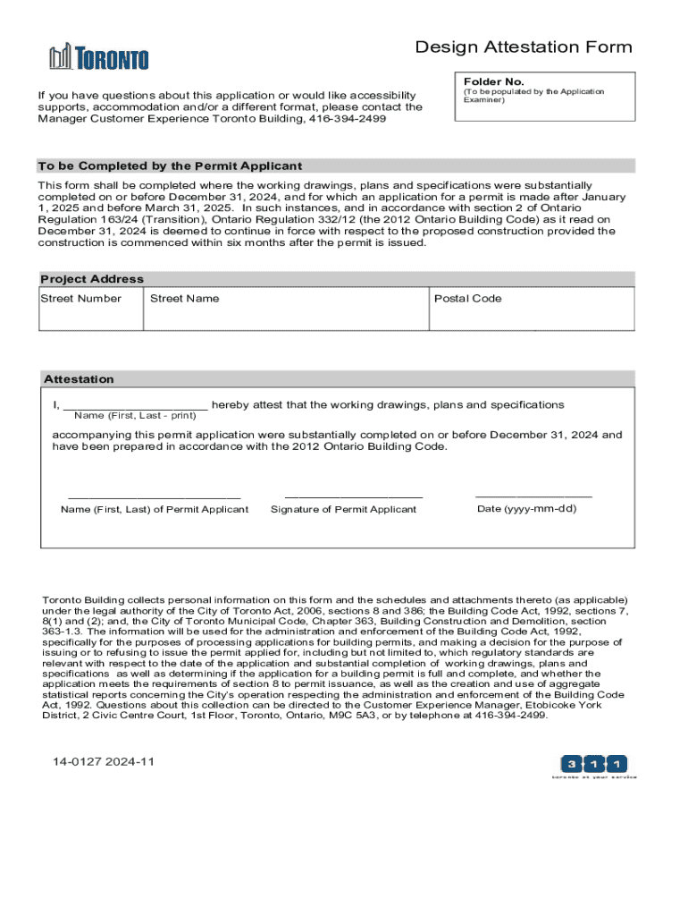 Design Attestation Form If you have questions about this application or would like accessibility supports, accommodation and/or a different format, please contact the Manager Customer Experience Toronto