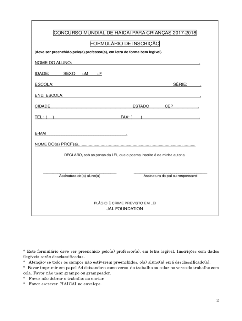 Obtenha o gratuito Formulário De Inscrição - Concurso Mundial De Haicai Para Crianças 2017-2018