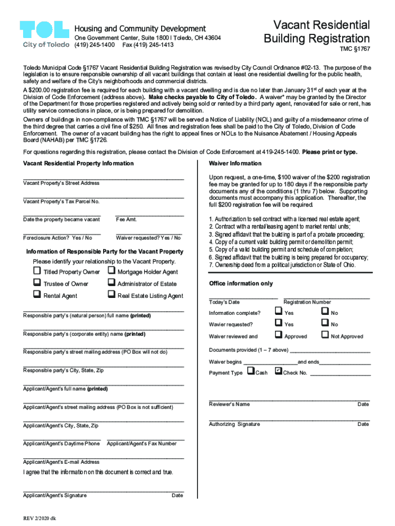 The Vacant Residential Building Registration is a document intended for the registration of vacant residential properties in Toledo, ensuring responsible ownership and compliance with Toledo Municipal Code §1767. A registration fee is required, and there are provisions for waivers and appeals for non-compliance.