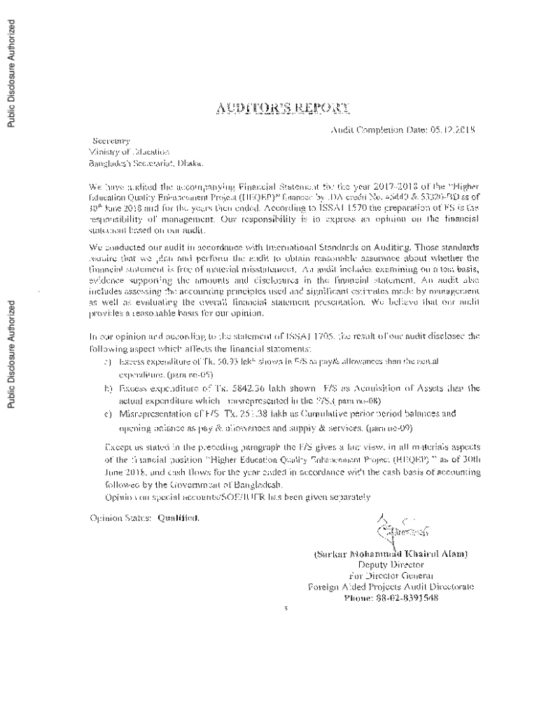 Public Disclosure AuthorizedAUIOR\'REPORT Audit Completion Date: 05.12.2018SecretaryPublic Disclosure AuthorizedPublic Disclosure AuthorizedPublic Disclosure AuthorizedNtinistry of EducationBangladesh