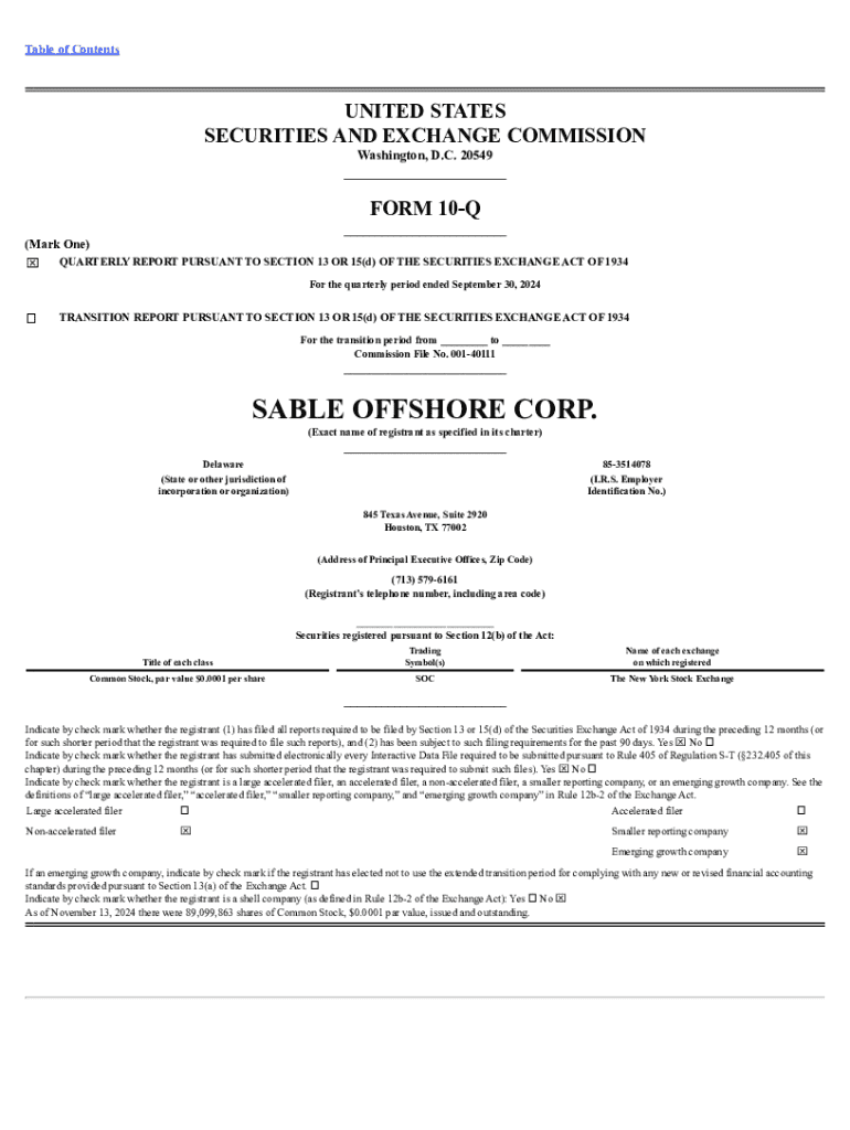 Este informe trimestral incluye información financiera y discusión sobre la situación financiera de Sable Offshore Corp. para el período terminado el 30 de septiembre de 2024. El documento detalla su desempeño, ingreso, gastos operativos y otros aspectos financieros relevantes después de completar una combinación de negocios.