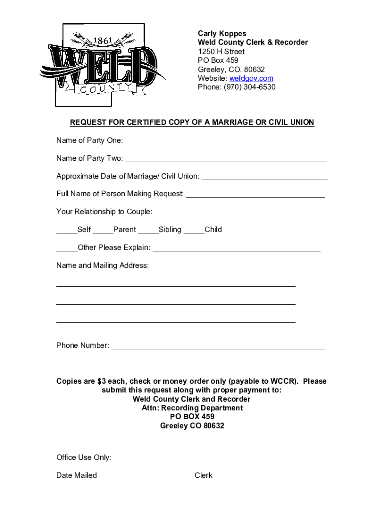 This document is a formal request for obtaining certified copies of a marriage or civil union from the Weld County Clerk & Recorder. It requires information about the parties involved, the date of the marriage or civil union, and the relationship of the requester to the couple. Payment guidelines are also provided.