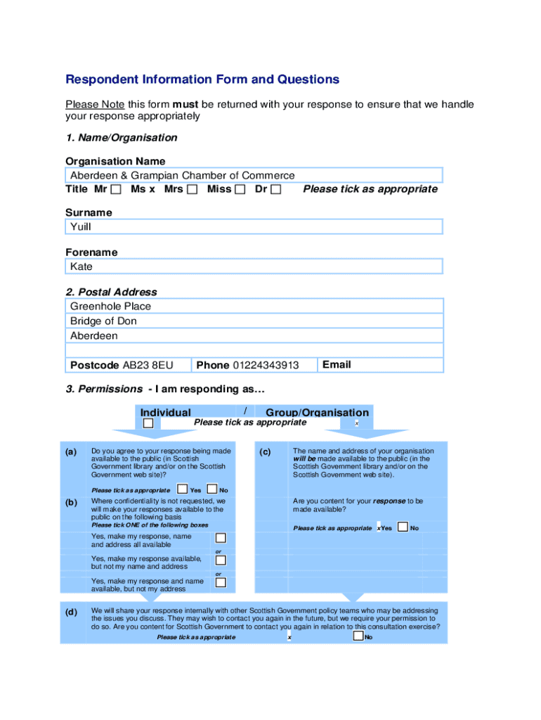 This document contains the respondent information for the Rail 2014 consultation, detailing the views of Aberdeen & Grampian Chamber of Commerce on rail services, connectivity, and passenger experience improvements in Scotland. It emphasizes the importance of maintaining services such as cross-border trains and the Caledonian Sleeper, while highlighting issues faced by passengers.