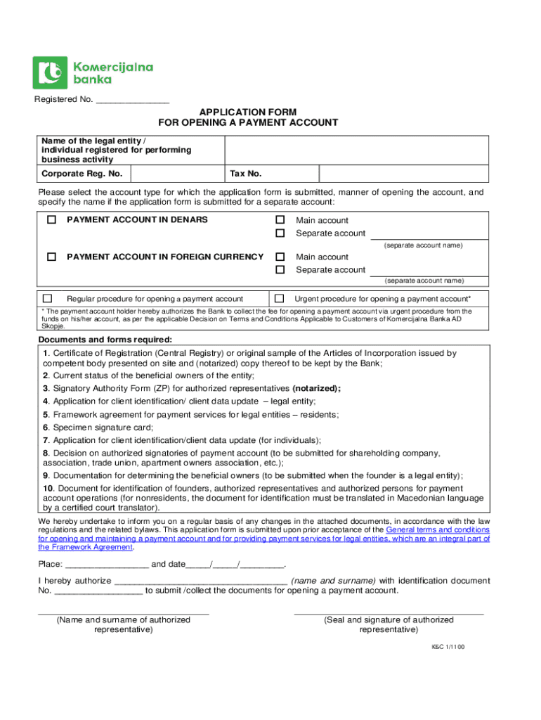 Registered No. ___APPLICATION FORM FOR OPENING A PAYMENT ACCOUNT Name of the legal entity / individual registered for performing business activity Corporate Reg. No.Tax No.Please select the account