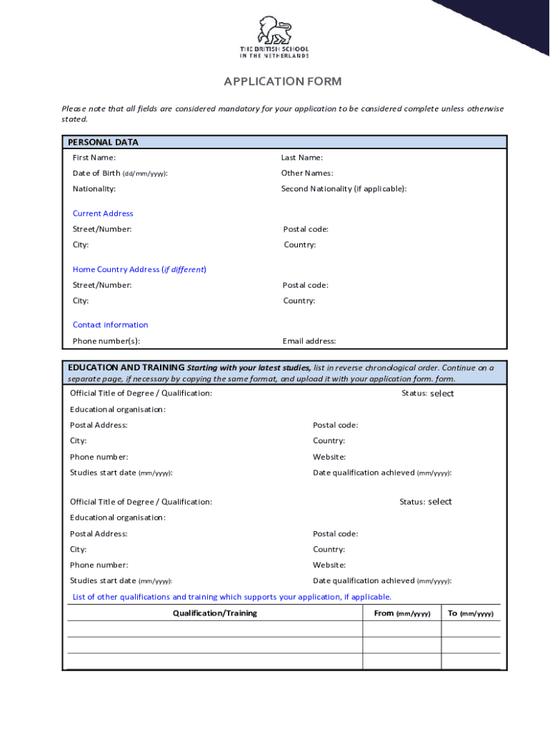 APPLICATION FORM Please note that all fields are considered mandatory for your application to be considered complete unless otherwise stated.PERSONAL DATA First Name:Last Name:Date of Birth (dd/mm/yyyy):Other