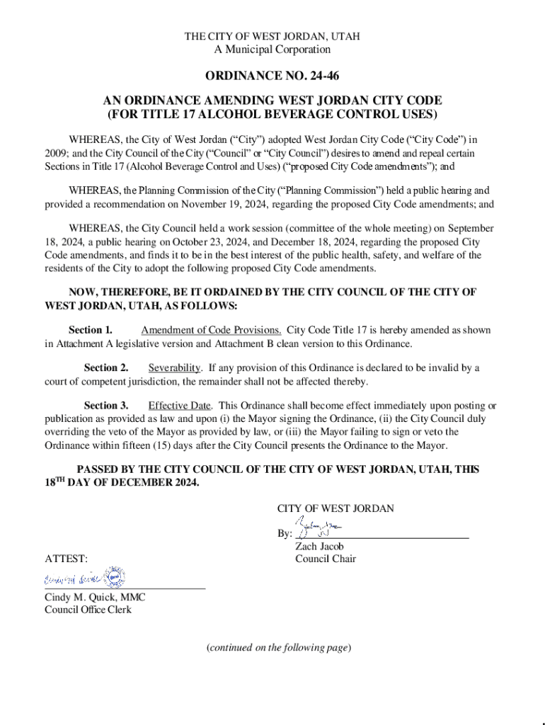 An ordinance amending the West Jordan City Code concerning the regulation of alcohol beverage control and uses to simplify the control regulation and protect public interests.