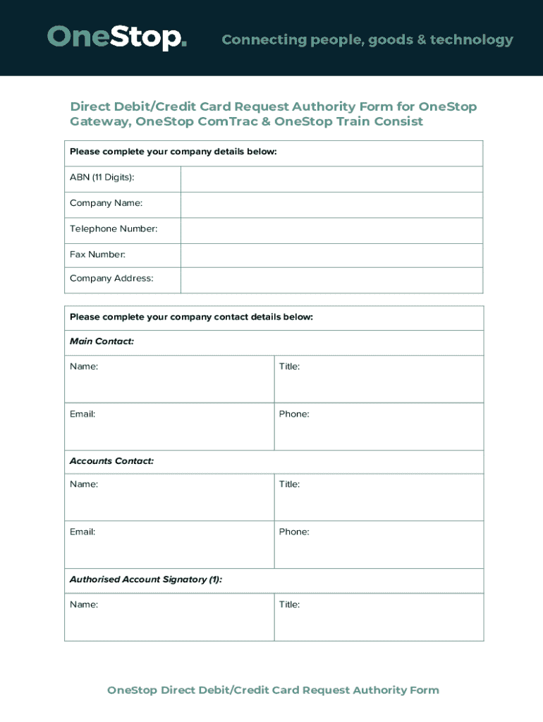 This form is used to authorize direct debit or credit card payments for OneStop services including Gateway, ComTrac, and Train Consist. It requires the submission of company and contact details, selection of services, and payment agreement information.