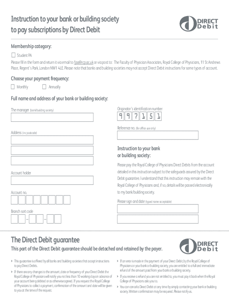 Instruction to your bank or building society to pay subscriptions by Direct Debit Membership category: Student PA Please fill in the form and return it via email to fpa@rcp.ac.uk or via post to: The