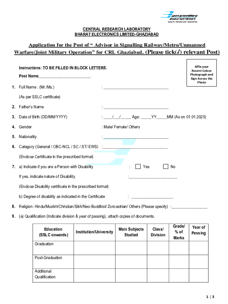 This document is an application form for candidates applying for the position of Advisor at the Central Research Laboratory, Bharat Electronics Limited, Ghaziabad. It includes personal details, educational qualifications, work experience, and a declaration by the applicant.