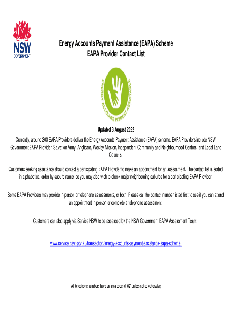 Energy Accounts Payment Assistance (EAPA) Scheme EAPA Provider Contact ListUpdated 3 August 2022 Currently, around 200 EAPA Providers deliver the Energy Accounts Payment Assistance (EAPA) scheme.