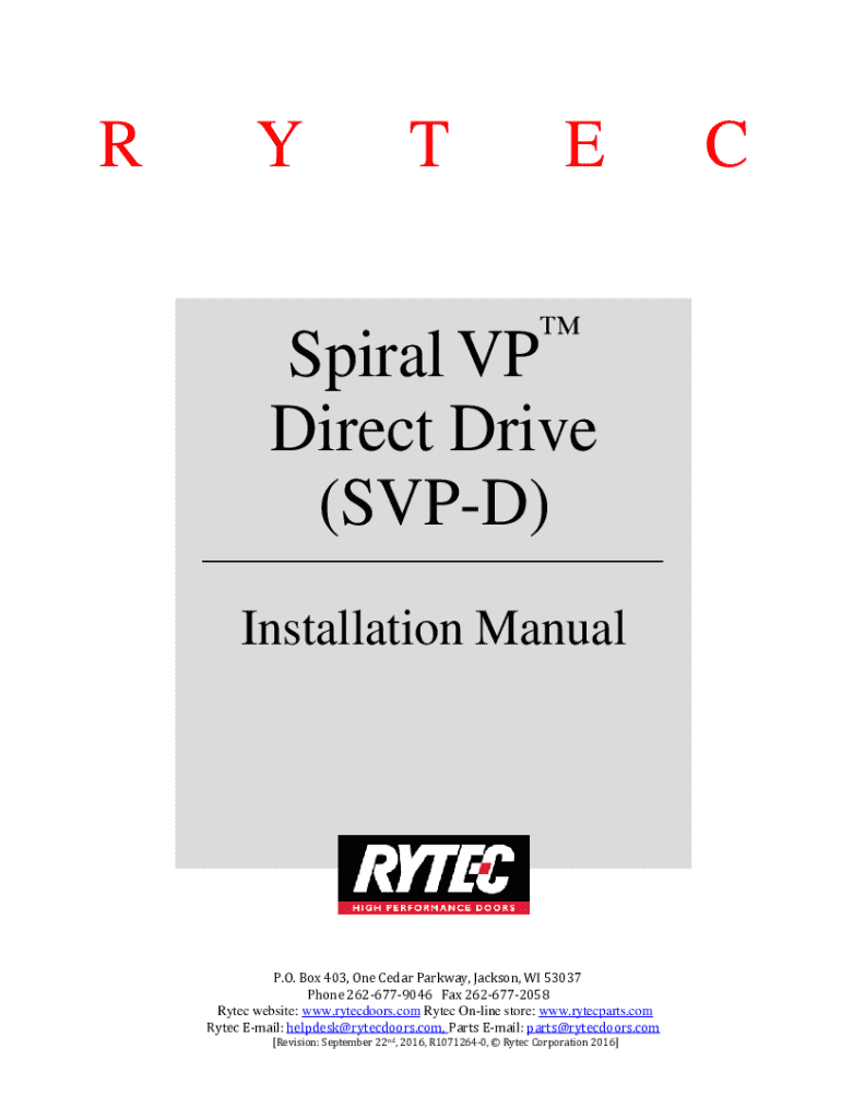 RYTE Spiral VP Direct Drive (SVPD) Installation ManualP.O. Box 403, One Cedar Parkway, Jackson, WI 53037 Phone 2626779046 Fax 2626772058 Rytec website: www.rytecdoors.com Rytec Online store: www.rytecparts.com