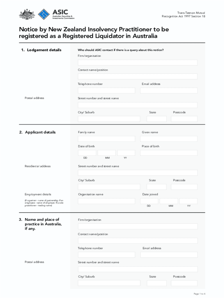 This document serves as a notice for New Zealand insolvency practitioners seeking registration as registered liquidators in Australia under the Trans-Tasman mutual recognition principle. It includes details about the applicant, participating jurisdictions, relevant declarations, consent for inquiries, and required attachments.