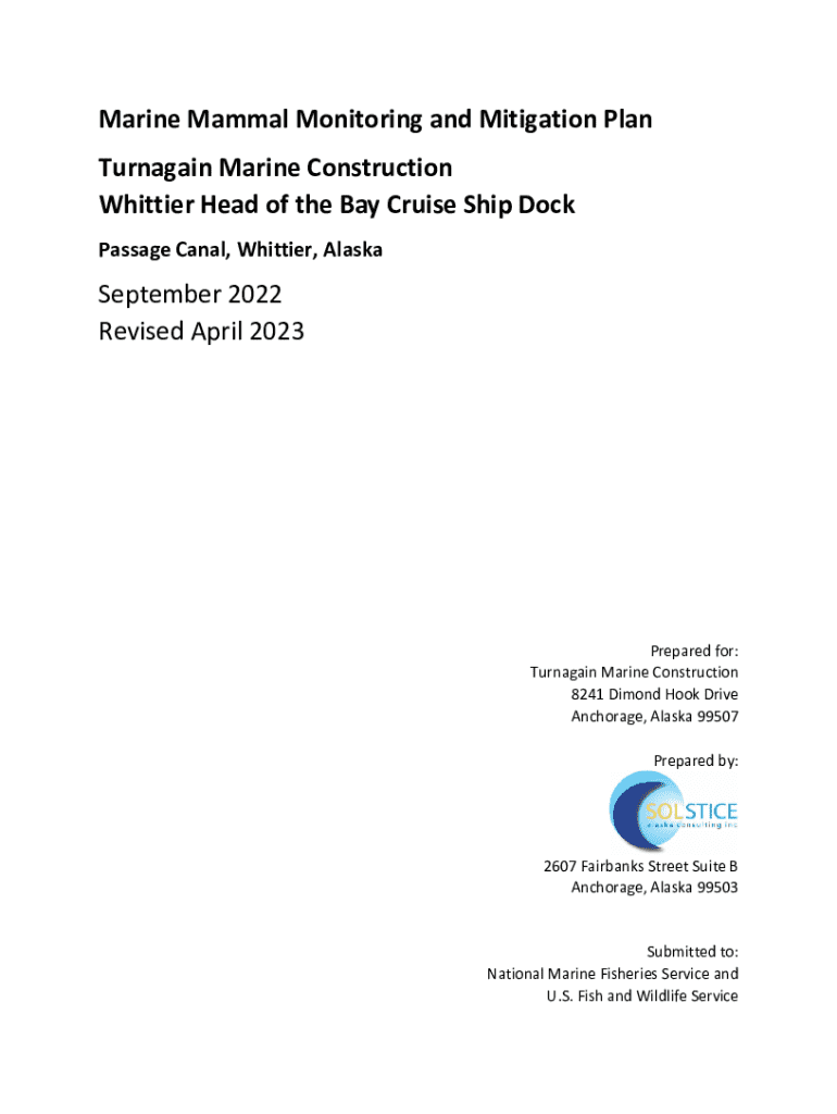 This document outlines the Marine Mammal Monitoring and Mitigation Plan (4MP) for the Whittier Head of the Bay Cruise Ship Dock Project in Alaska. It details monitoring and mitigation measures to minimize marine mammal harassment during construction activities, compliance with the Endangered Species Act (ESA) and Marine Mammal Protection Act (MMPA), as well as strategies for reporting and data collection.