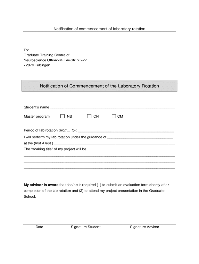 Notification of commencement of laboratory rotationTo: Graduate Training Centre of Neuroscience OtfriedMllerStr. 2527 72076 TbingenNotification of Commencement of the Laboratory RotationStudents name