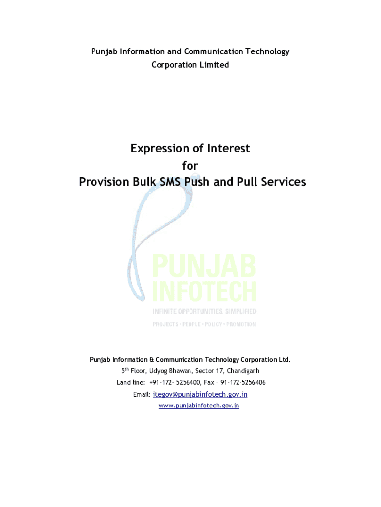 This document serves as an Expression of Interest (EOI) issued by the Punjab Information and Communication Technology Corporation Ltd. to invite proposals from reputable companies for the provision of bulk SMS push and pull services, aimed at facilitating election activities across approximately 20,000 polling stations in Punjab.