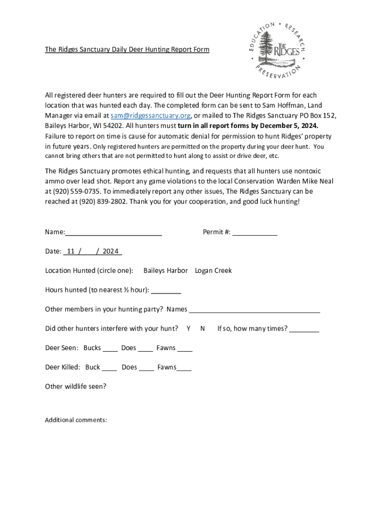 This form is required for all registered deer hunters at The Ridges Sanctuary to report their daily hunting activities. It includes details such as location hunted, hours spent, and wildlife observed. The completed form must be submitted by December 5, 2024, or hunting permissions may be denied in future years. The Ridges Sanctuary promotes ethical hunting practices.
