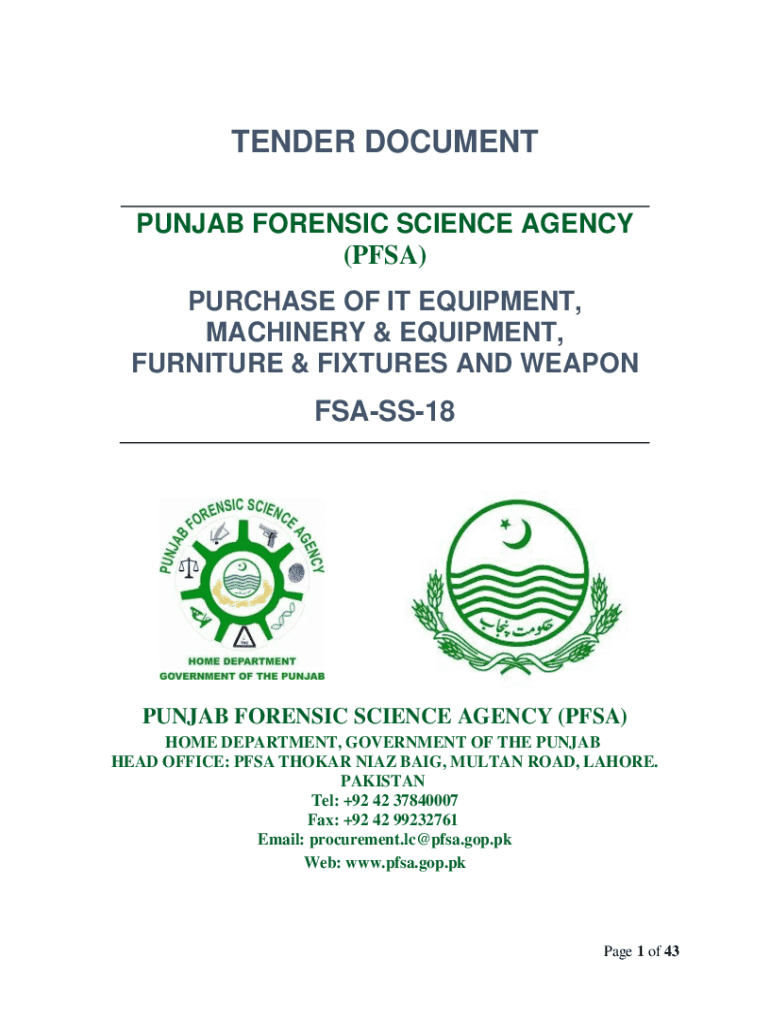TENDER DOCUMENT PUNJAB FORENSIC SCIENCE AGENCY (PFSA) PURCHASE OF IT EQUIPMENT, MACHINERY & EQUIPMENT, FURNITURE & FIXTURES AND WEAPONFSASS18PUNJAB FORENSIC SCIENCE AGENCY (PFSA) HOME DEPARTMENT,