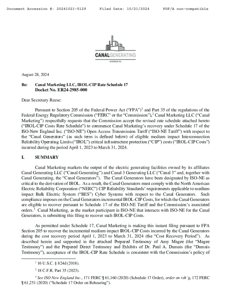 Document Accession #: 202410215129Filed Date: 10/21/2024PDF/A noncompatibleAugust 28, 2024 Re:Canal Marketing LLC, IROLCIP Rate Schedule 17Docket No. ER242985000 Dear Secretary Reese: Pursuant to